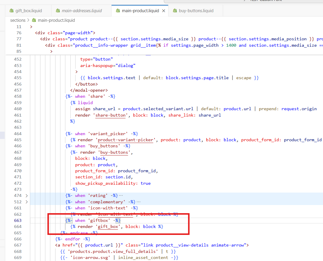 Still in main-product.liquid, add the render code for your gift box snippet in the right place: