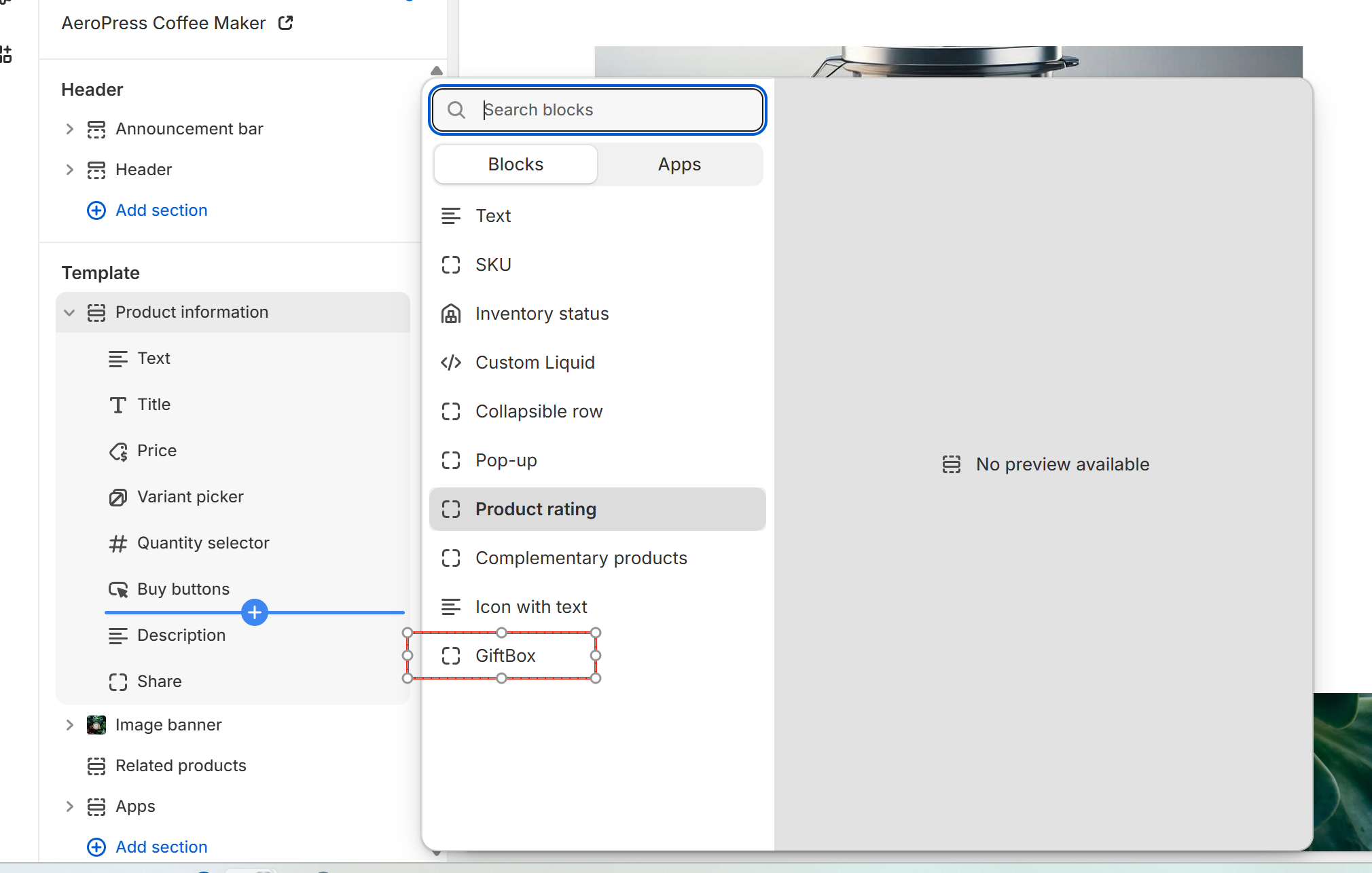 Go back to your Theme Editor, navigate to a product page, and you’ll see the new block option available under Product Information. Add it, adjust the settings as needed, and save your changes.