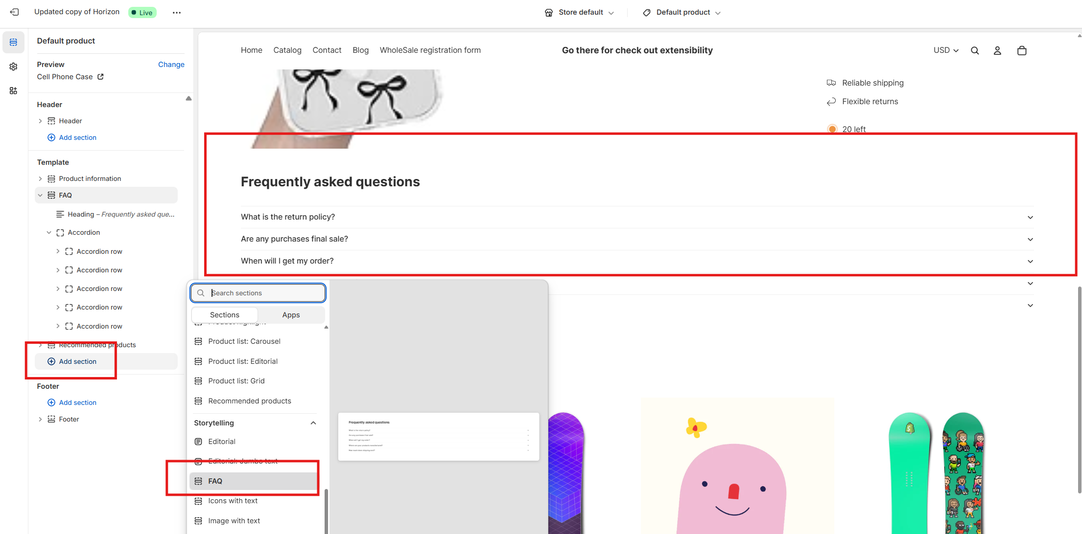 Select your product template and add a FAQ list section to the template. At this point, the FAQ section is static, meaning the same questions will appear on every product.