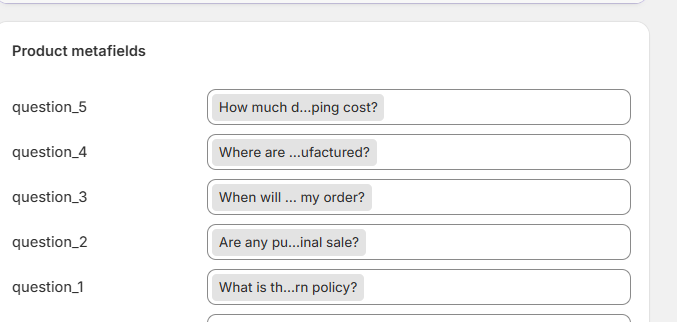 For example, you might create multiple metafields such as question_1, question_2, and so on, each referencing a product_faq entry.