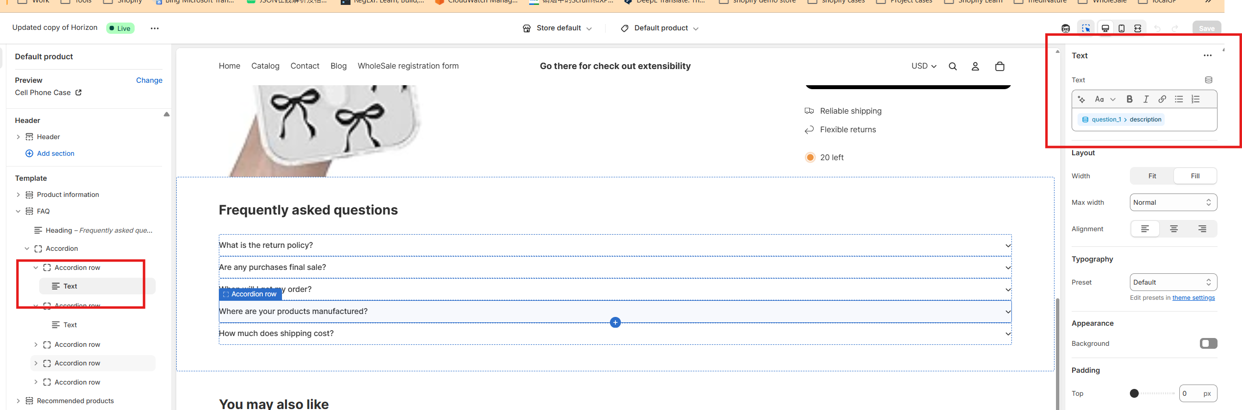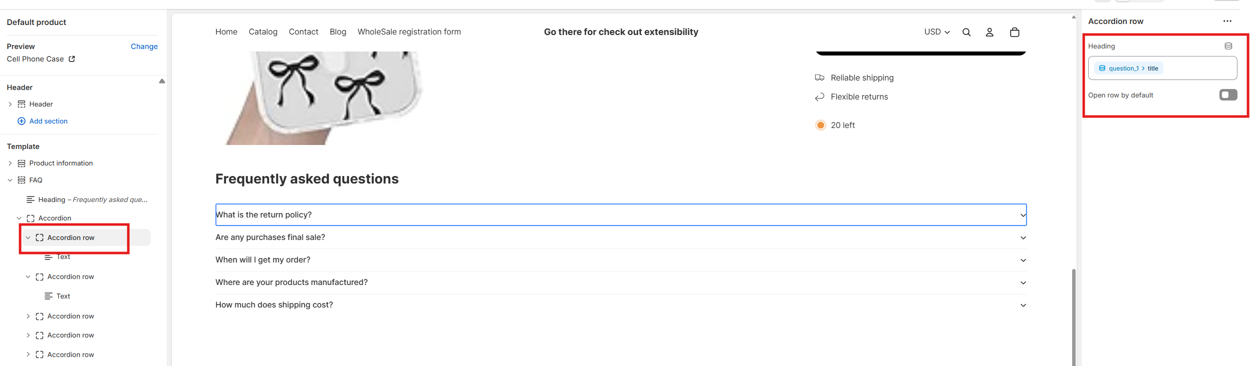 Open the product template and locate the FAQ list section you added earlier.