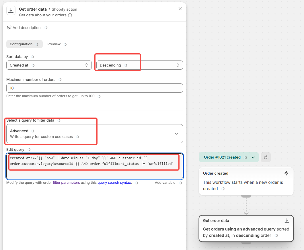 Shopify Flow query capabilities can vary. The purpose of this query is to limit results to recent, relevant orders. Always validate this logic in your Flow environment.