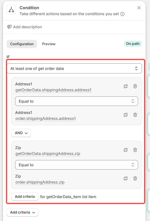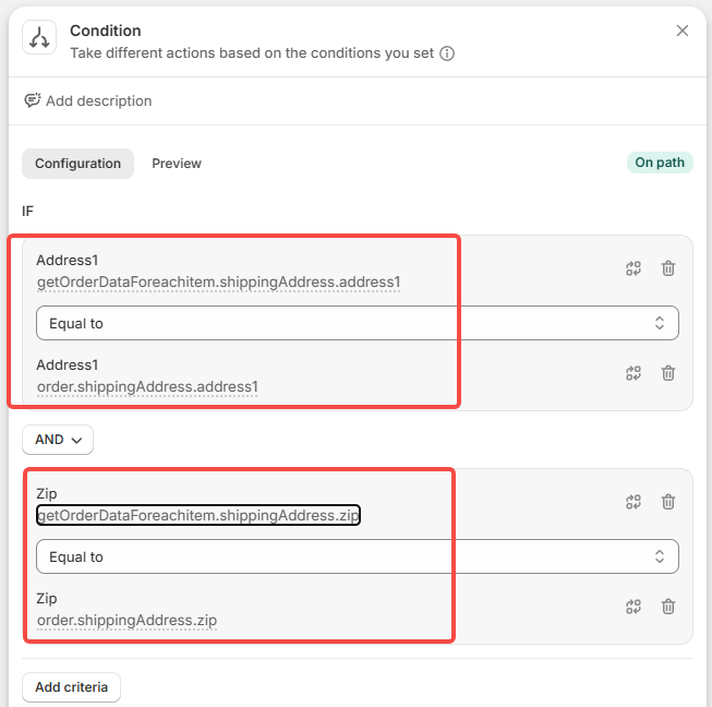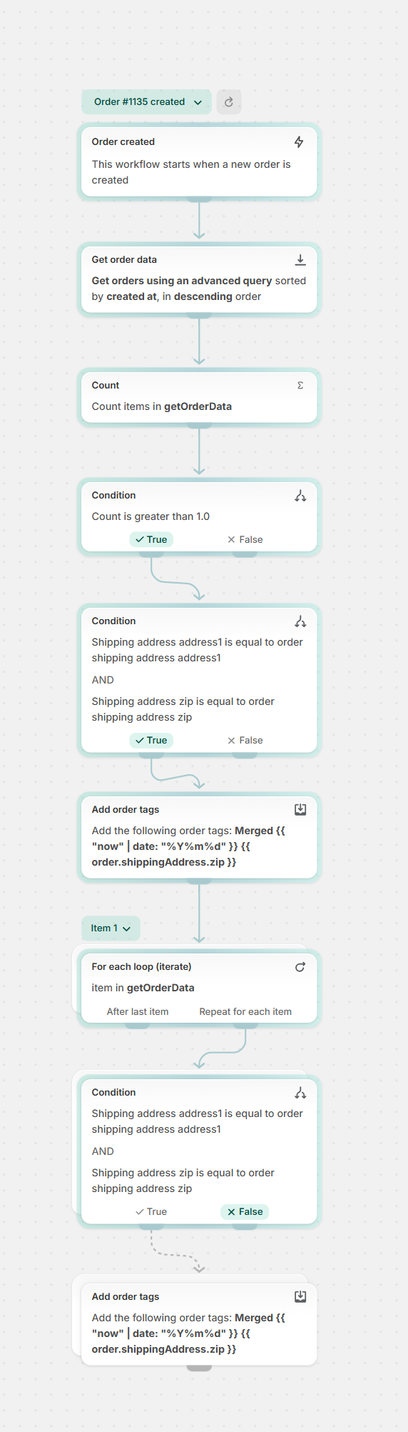 dfb5a88fbd16832dc0b801f0376292645228c361fb4848706dd2dc40c63eefe2:{"__metadata":{"version":0.1},"root":{"steps":[{"step_id":"7b13a403-3679-4669-b1dc-5b0400441b73","step_position":[0,0],"config_field_values":[],"task_id":"shopify::admin::order_created","task_version":"0.1","task_type":"TRIGGER","description":null,"note":null,"name":null},{"step_id":"7d3043ee-2b96-4462-a894-ed447d16d5ef","step_position":[0,200],"config_field_values":[{"config_field_id":"sort_by","value":"{\"sortKey\":\"CREATED_AT\",\"order\":\"DESCENDING\"}"},{"config_field_id":"max_root_records","value":"100"},{"config_field_id":"query","value":"created_at:>='{{ \"now\" | date_minus: \"1 day\" }}' AND customer_id:{{ order.customer.legacyResourceId }} AND fulfillment_status:unfulfilled"}],"task_id":"shopify::flow::fetch::orders","task_version":"v1","task_type":"ACTION","description":null,"note":null,"name":"Get order data"},{"step_id":"c1e87b95-aa32-41da-9f30-723755880a38","step_position":[0,360],"config_field_values":[{"config_field_id":"listpath","value":"getOrderData"}],"task_id":"shopify::flow::count","task_version":"0.1","task_type":"ACTION","description":null,"note":null,"name":"Count"},{"step_id":"21562dda-3285-43c4-9796-ae0196c765fb","step_position":[0,500],"config_field_values":[{"config_field_id":"condition","value":"{\"uuid\":\"01KJVW0MHBB8FSTYRR9VR6N80S\",\"lhs\":{\"uuid\":\"01KJVW0MHB12H84FQJHDTZ423P\",\"parent_uuid\":\"01KJVW0MHBB8FSTYRR9VR6N80S\",\"lhs\":{\"uuid\":\"01KJVW0MHBEVC5YSRHFA8QXQ5P\",\"parent_uuid\":\"01KJVW0MHB12H84FQJHDTZ423P\",\"value\":\"count\",\"comparison_value_type\":\"EnvironmentValue\",\"full_environment_path\":\"count\"},\"rhs\":{\"uuid\":\"01KJVW0MHBE16J1HT873WJ78ED\",\"parent_uuid\":\"01KJVW0MHB12H84FQJHDTZ423P\",\"value\":\"1.0\",\"comparison_value_type\":\"LiteralValue\"},\"value_type\":\"EnvironmentScalarDefinition:Int\",\"operator\":\">\",\"operation_type\":\"Comparison\"},\"operator\":\"AND\",\"operation_type\":\"LogicalExpression\"}"}],"task_id":"shopify::flow::condition","task_version":"0.1","task_type":"CONDITION","description":null,"note":null,"name":null},{"step_id":"6607f6b9-0188-4306-af7a-3f45afacdd55","step_position":[0,660],"config_field_values":[{"config_field_id":"condition","value":"{\"uuid\":\"01KJVW0MHV2619YQ50125NKP0H\",\"lhs\":{\"uuid\":\"01KJVW0MHV058M0ZYHBWGYSC85\",\"parent_uuid\":\"01KJVW0MHV2619YQ50125NKP0H\",\"array_path\":{\"uuid\":\"01KJVW0MHVPNWA2XEDNYHWKGNM\",\"parent_uuid\":\"01KJVW0MHV058M0ZYHBWGYSC85\",\"value\":\"getOrderData\",\"comparison_value_type\":\"EnvironmentValue\",\"full_environment_path\":\"getOrderData\"},\"array_item_key\":{\"uuid\":\"01KJVW0MHVQ3QBZQ5PTS45M0GY\",\"parent_uuid\":\"01KJVW0MHV058M0ZYHBWGYSC85\",\"value\":\"getOrderData_item\",\"comparison_value_type\":\"EnvironmentValue\"},\"operation\":{\"uuid\":\"01KJVW0MHVCCVDX1RV750KFA5C\",\"parent_uuid\":\"01KJVW0MHV058M0ZYHBWGYSC85\",\"lhs\":{\"uuid\":\"01KJVW0MHVBBM3G7V31BPR5STB\",\"parent_uuid\":\"01KJVW0MHVCCVDX1RV750KFA5C\",\"lhs\":{\"uuid\":\"01KJVW0MHV9TBPVSY24Y8M2W9B\",\"parent_uuid\":\"01KJVW0MHVBBM3G7V31BPR5STB\",\"value\":\"getOrderData_item.shippingAddress.address1\",\"comparison_value_type\":\"EnvironmentValue\",\"full_environment_path\":\"getOrderData.shippingAddress.address1\"},\"rhs\":{\"uuid\":\"01KJVW0MHV0BXBYHP448716VWT\",\"parent_uuid\":\"01KJVW0MHVBBM3G7V31BPR5STB\",\"value\":\"order.shippingAddress.address1\",\"comparison_value_type\":\"EnvironmentValue\"},\"value_type\":\"EnvironmentScalarDefinition:String\",\"operator\":\"==\",\"operation_type\":\"Comparison\"},\"rhs\":{\"uuid\":\"01KJVW0MHV93K6KQAE4FPHWAQ8\",\"parent_uuid\":\"01KJVW0MHVCCVDX1RV750KFA5C\",\"lhs\":{\"uuid\":\"01KJVW0MHVV9TW2PQ23HD8YEEK\",\"parent_uuid\":\"01KJVW0MHV93K6KQAE4FPHWAQ8\",\"value\":\"getOrderData_item.shippingAddress.zip\",\"comparison_value_type\":\"EnvironmentValue\",\"full_environment_path\":\"getOrderData.shippingAddress.zip\"},\"rhs\":{\"uuid\":\"01KJVW0MHV99820F79G7CX02YK\",\"parent_uuid\":\"01KJVW0MHV93K6KQAE4FPHWAQ8\",\"value\":\"order.shippingAddress.zip\",\"comparison_value_type\":\"EnvironmentValue\"},\"value_type\":\"EnvironmentScalarDefinition:String\",\"operator\":\"==\",\"operation_type\":\"Comparison\"},\"operator\":\"AND\",\"operation_type\":\"LogicalExpression\"},\"operator\":\"ANY\",\"operation_type\":\"ArrayExpression\"},\"operator\":\"AND\",\"operation_type\":\"LogicalExpression\"}"}],"task_id":"shopify::flow::condition","task_version":"0.1","task_type":"CONDITION","description":null,"note":null,"name":null},{"step_id":"7acf1763-b507-4822-aacd-8504ff5bbae3","step_position":[0,900],"config_field_values":[{"config_field_id":"order_id","value":"{\"value\":null,\"default_value\":\"order.id\"}"},{"config_field_id":"tags","value":"[\"Merged {{ \\\"now\\\" | date: \\\"%Y%m%d\\\" }} {{ order.shippingAddress.zip }}\"]"}],"task_id":"shopify::admin::add_order_tags","task_version":"0.1","task_type":"ACTION","description":null,"note":null,"name":null},{"step_id":"fa0f6d08-4206-4234-96ba-56a7c9d1ee81","step_position":[0,1080],"config_field_values":[{"config_field_id":"listpath","value":"getOrderData"}],"task_id":"shopify::flow::foreach","task_version":"0.1","task_type":"FOREACH","description":null,"note":null,"name":null},{"step_id":"7a8ecebd-f74a-4ae2-9820-bbdcf104c472","step_position":[0,1240],"config_field_values":[{"config_field_id":"condition","value":"{\"uuid\":\"01KJVW0MJ9J7JSWCE9P77B436V\",\"lhs\":{\"uuid\":\"01KJVW0MJ92ZT4JHFFXZTCQPX5\",\"parent_uuid\":\"01KJVW0MJ9J7JSWCE9P77B436V\",\"lhs\":{\"uuid\":\"01KJVW0MJ9THJJ6ZF37WM62XAB\",\"parent_uuid\":\"01KJVW0MJ92ZT4JHFFXZTCQPX5\",\"value\":\"getOrderDataForeachitem.shippingAddress.address1\",\"comparison_value_type\":\"EnvironmentValue\",\"full_environment_path\":\"getOrderDataForeachitem.shippingAddress.address1\"},\"rhs\":{\"uuid\":\"01KJVW0MJ9QNQTG7QF0JQKDDGS\",\"parent_uuid\":\"01KJVW0MJ92ZT4JHFFXZTCQPX5\",\"value\":\"order.shippingAddress.address1\",\"comparison_value_type\":\"EnvironmentValue\"},\"value_type\":\"Envi