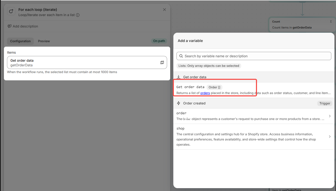 Flow → Count → Get order data